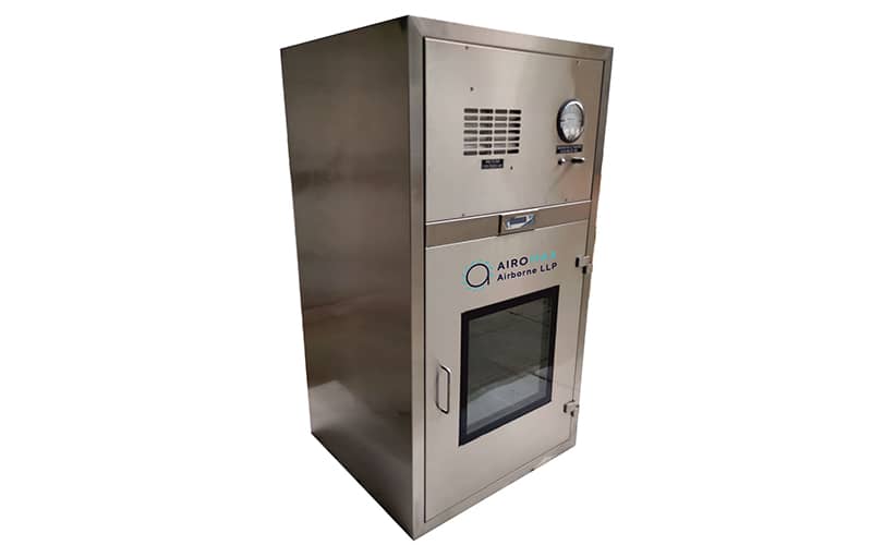 Dynamic Pass Box made of stainless steel 304 grade, double walled, fitted with magnetic interlocking system on two doors. Complete with motor blower and HEPA filter’ magnehelic gauge for pressure, flourescent light, UV light for germinal free area.